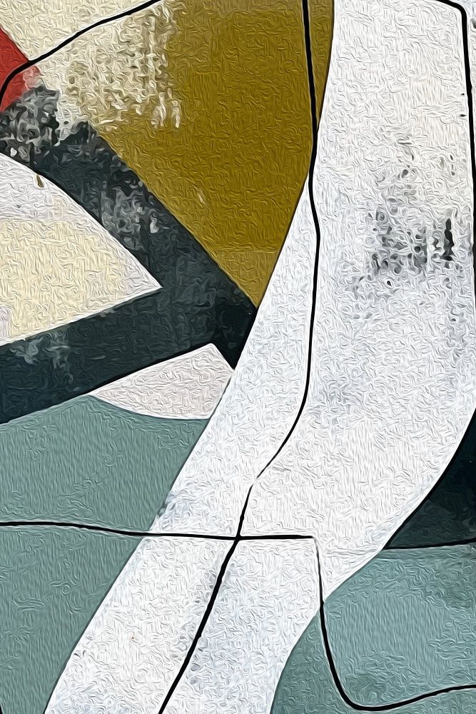 Een abstract schilderij in olieverfstijl met velden en figuren in verschillende gemengde kleuren.
