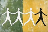 Dit unieke kunstwerk toont een expressieve weergave van verbondenheid en samenwerking. De silhouetten van figuren, geschilderd in een eenvoudige maar krachtige stijl, vormen een keten die harmonie en eenheid symboliseert. De achtergrond in contrasterende tinten groen en geel voegt diepte en karakter toe, terwijl het gebruik van wit en zwart de aandacht vestigt op de krachtige vormen. Ideaal voor moderne interieurs zoals kantoren, woonkamers of werkruimtes. Dit schilderij straalt een tijdloze charme uit en inspireert tot samenkomen en begrip. Een prachtige aanvulling voor wie een krachtig visueel statement wil maken.