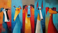 De stijl is speels en tegelijkertijd gelaagd: lijnen lopen in elkaar over, kleuren botsen én harmoniëren, en de honden lijken zich te bewegen in een wereld die niet helemaal klopt – precies wat de verwarring versterkt. Deze creatieve benadering geeft het werk een moderne en artistieke uitstraling, perfect voor interieurs die durven op te vallen.