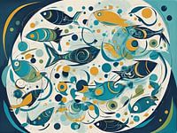 Deze creatie toont een levendig tafereel van abstracte vissen, gedetailleerd weergegeven in een palet van blauw- en groentinten, met accenten van geel. De visvormen zijn dynamisch en vloeiend, wat het gevoel van beweging in het water oproept. De gestileerde lijnen en geometrische vormen die de vissen omringen, geven het werk een moderne en speelse uitstraling, waarbij invloeden van kubisme en abstract expressionisme duidelijk zichtbaar zijn.