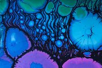 "Abstracte vloeibare kleuren: Paars, blauw, turqouise, groen met lijnen" is een vrolijk abstract werk met koele kleuren in verschillende vloeistoffen (onder andere acrylverf) die over het canvas "stromen" (abstract).