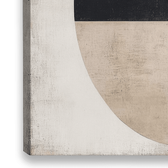 Een harmonieus samenspel van geometrische vormen ontvouwt zich voor de kijker. Een grote halve cirkel met een elegante rand wordt vergezeld door een kleine stip en lichte, subtiele texturen. Zwart en beige dansen in contrast, terwijl het kalme, neutrale canvas ruimte creëert voor interpretatie en symmetrie. De compositie straalt…