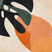 Hier ontvouwt zich een harmonieus samenspel van organische vormen en levendige kleuren. Donkergroen en fel oranje versmelten met zachte, aardse tinten, terwijl de gebogen lijnen doen denken aan tropische planten. Deze compositie straalt een kalmerende energie uit die de kijker meeneemt naar een wereld van creativiteit en nabijheid tot de natuur.