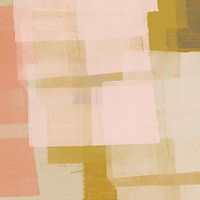 Abstracte vormen, lijnen en kleurblokken in warm okergeel, taupe, wit en roze.