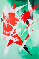 Dynamische vormen en gedurfde kleuren smelten samen tot een levendig schouwspel van rood en wit, omlijst door rustgevend groen. De energie van deze compositie straalt inspiratie uit en trekt onmiddellijk de aandacht. Perfect voor een moderne woonkamer, waar het gesprekken stimuleert en een creatieve sfeer bevordert.