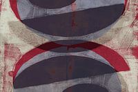Gemengde media collage van monotypes, texturen, geometrische vormen in gedempte neutrale kleuren.