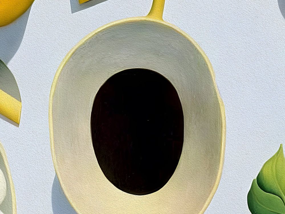 Moderne abstracte hedendaagse kunst met surrealistische fruitsoorten als lycee, mango en eieren in zachte frisse kleuren geel, rood en groen op een lichte achtergrond. Abstracte vormen die perfect passen bij een modern, Scandinavisch of minimalistisch interieur.