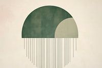 Een geometrisch spel van zachte groene tinten ontvouwt zich, terwijl een halfronde boog harmonieus samengaat met een kleine, afgeronde hoek. Daaronder strekken delicate lijnen zich uit als vallende regen, waardoor een subtiele dynamiek ontstaat. Minimalistisch maar expressief, dit ontwerp nodigt uit tot reflectie en mijmering.