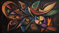 Het kleurenpalet is gedurfd en levendig, met een mix van warme en koele tinten zoals geel, diepblauw, rood, roze en turquoise. Deze tinten vormen samen een visueel dynamisch geheel dat voortdurend in beweging lijkt. De compositie is speels maar gebalanceerd, met lagen en patronen die diepte en ritme toevoegen aan het werk. Het lange, horizontale formaat versterkt dit effect en maakt het ideaal voor grotere wanden of ruimten waar je een echte blikvanger zoekt.