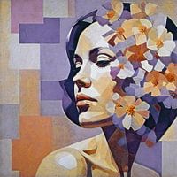 Dit is een digitaal kunstwerk van een portret van een abstracte vrouw met bloemen rond haar hoofd. Een vrolijk en kleurrijk schilderij geschikt voor elke ruimte.