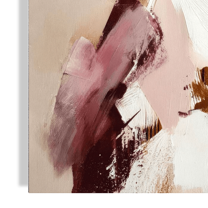 Een abstracte, elegante vrouwenfiguur in een zachte pastelwereld van blush, crème en warm bruin. Met losse, expressieve penseelstreken en gelaagde verfvlakken ontstaat een silhouet dat tegelijk fragiel en krachtig aanvoelt. De donkere top geeft contrast en structuur, terwijl de lichte, bijna transparante lagen eromheen zorgen voor lucht…
