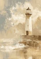 Een abstract olieverfschilderij toont een vuurtoren aan de kust in zachte beige en grijze tinten. Het zachte, gedempte kleurenpalet en de zichtbare penseelstreken geven het werk een harmonieuze, dromerige vintage stijl. Fijne details en lichtaccenten creëren diepte en rust, terwijl de minimalistische compositie de vredige sfeer van het…