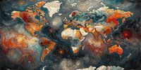Deze gedurfde abstracte impressionistische wereldkaart straalt een robuuste, industriële uitstraling uit met zijn turbulente compositie van gedraaide, roestige oranje, verbrand sienna en gesmolten metaaltinten. De vormen van de continenten worden gesuggereerd door zwaar getextureerde, kronkelende penseelstreken die bewegen als een omstuimige, gesmolten massa. Diepe, donkerblauw-grijze stortvloeden contrasteren fel met heldere, witgloeiende tonen, wat een gevoel van intense hitte en energie creëert.