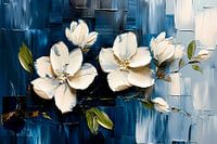 Over ‘Abstracte witte bloemen op blauwe achtergrond’ van Art & Soul Creations