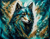 Een majestueuze wolf met doordringende ogen is afgebeeld te midden van een abstracte mix van turquoise en bruine tinten. De dynamische wervelingen en spatten van kleur rond het dier geven het een levendige maar mystieke uitstraling.