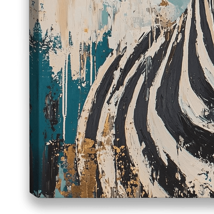 Deze unieke schilderijafbeelding combineert het opvallende patroon van zebras met een abstracte, expressieve achtergrond. De combinatie van goud- en blauwtinten met de zwart-witte strepen maakt dit kunstwerk een echte blikvanger in elke ruimte. Perfect voor moderne interieurs, deze compositie brengt een vleugje natuur en artistieke…