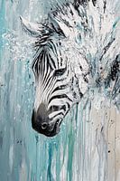 Dit ontwerp vangt de energie van een zebra op een bijzondere manier, waarbij het dier lijkt te verdwijnen in een spetterend kleurenspel van wit, zwart en turquoise tinten. De gedetailleerde strepen van de zebra worden gemengd met een dynamisch patroon van verfspatten en abstracte penseelstreken, wat het werk zowel levendig als…