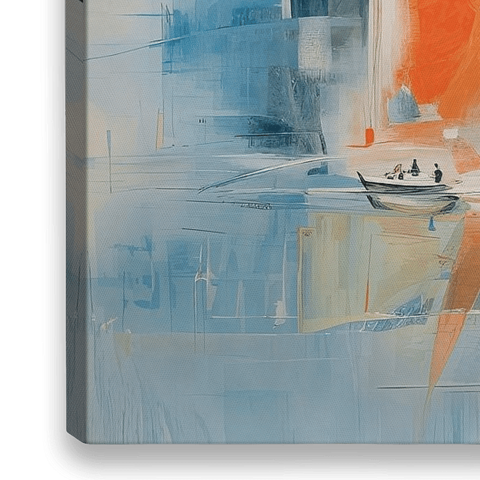 Modern decoratief motief van abstracte zeilboten in delicate blauwe en oranje tinten.