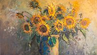 Abstracte zonnebloem in vaas panorama schilderij die een prachtige luxe toevoeging zal zijn aan elke ruimte. Met zijn unieke en stijlvolle uitstraling is het een ware eyecatcher. De schitterende kleuren en het bijzondere ontwerp maken dit kunstwerk 100% uniek en origineel. Het is de perfecte fotoprint om je interieur helemaal af te maken.