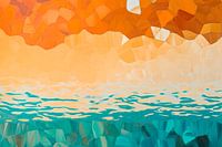 Met warme oranje tinten die overgaan in zachte koraalblauwe en aqua kleuren, vangt dit artistieke werk het zorgeloze gevoel van een zonsondergang aan zee. De harmonieuze kleurlagen geven de kamer een ontspannen sfeer en maken het de perfecte aanvulling voor een woonkamer of gezellige leeshoek.