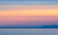 Abstracte zonsondergang met winterkleuren over het Vestfjord in één van de eilanden in de Vesteralen archipel dichtbij Lodingen in Noorwegen. De bergen in de verte zijn vaag zichtbaar door de zachte vage kleuren. Gemaakt door een zwieper aan de camera te geven tijdens een opname met een lange sluitertijd tijdens zonsondergang.