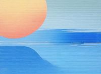 Abstracte zonsondergang over zee - Dit abstract schilderij toont een kalme zee van diverse blauwtinten met daarboven een zachte, grote, bijna zwevende oranje zon in een heldere hemel.