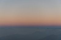 Abstracte zonsopkomst in Nepal. Enkele bergen zichtbaar door de mistige wolken. Simplistische landschapsfoto van de Himalaya.
