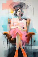 Een abstract schilderij van een vrouw die in alle stilte van haar rust geniet, in een comfortabele moderne stoel.