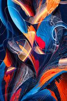 Binnen mijn reeks abstracte werken blijf ik mezelf steeds weer verbazen. Na mijn eerdere abstracte meesterwerken zoals 'De Diepte', 'Vrouwelijk Expressionisme' en 'Abstracte Skyline', brachten werken als 'Planeet 36', 'Abstracte Afrikaanse Schoonheid' en 'Abstract Portret van een Vrouw' mijn artistieke grenzen tot nieuwe hoogten. Het fundament voor dit werk werd gelegd door het abstracte portret 'Lady in Red Lines', eveneens een geslaagde creatie. Het complexe lijnenspel dat uit dat werk gegenereerd werd, vindt hier ook een thuis en vermengt zich met golvende organische vormen die aan bladeren doen denken, uitgevoerd in levendige tinten van blauw, rood en oranje.