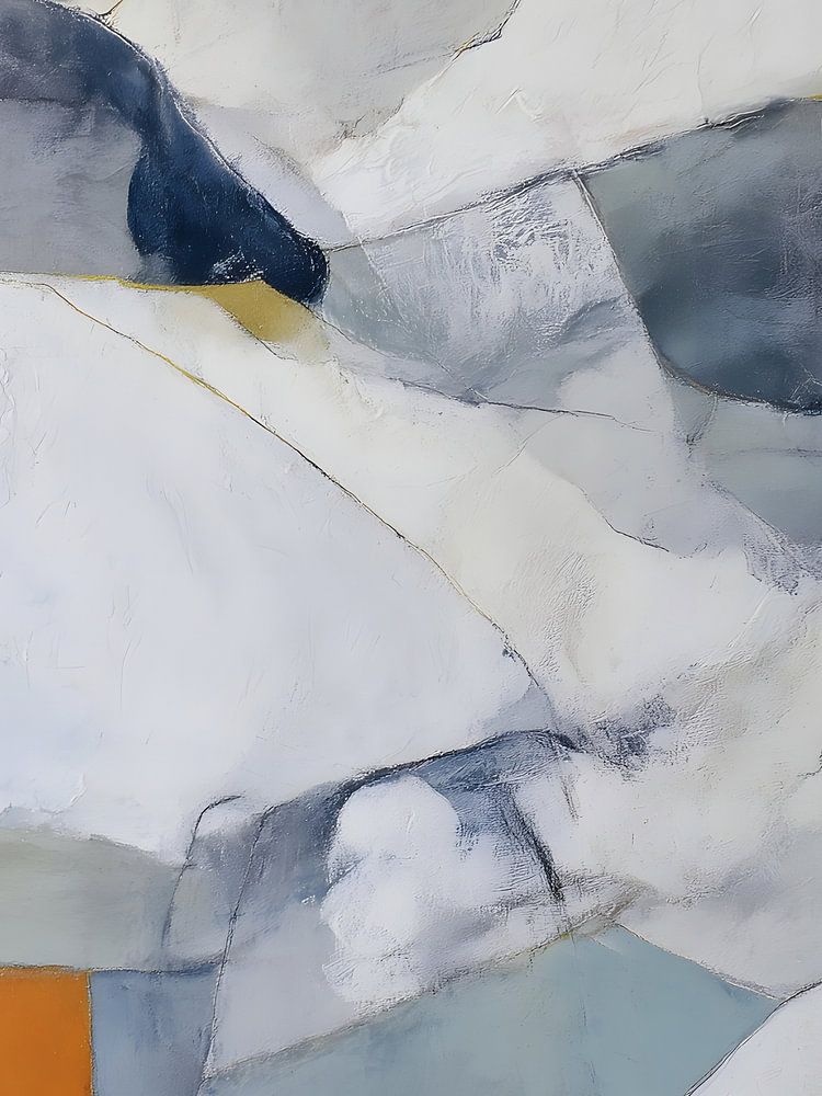 Zachte wittinten en koele blauwtinten vormen een rustgevende basis, terwijl gedurfde accenten van oker en diepblauw warmte en visuele intrige toevoegen. Subtiele lijnen en gelaagde texturen nodigen uit tot nadere beschouwing en bieden diepte en verfijning die herhaaldelijk kijken belonen.