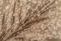 "Abstractie in beige en taupe: Lijnenspel met druppeltjes" is een macrofoto van een waterdruppeltjes die aan een grasaren hangen (lampenpoestersgras).