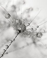 Abstractie in zwart, wit en grijs: Druppels op paardenbloempluisje" is een macrofoto van een pluisje van een paardenbloem. Op het pluisje van de paardenbloem zitten kleine druppeltjes water. Op de achtergrond zie je nog vaag andere pluisjes van de paardenbloem.