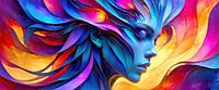 Abstractie van de elementen - Het mysterieuze gezicht van een etherische vrouw, omringd door golvende waaiers van blauw, paars en oranje, in tijdloze sereniteit van AidasignArt