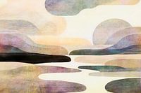 Een abstract schilderij van een landschap tijdens een zonsopgang in het noorden in organische geometrische vormen in goud, koper, grijs en beige kleuren met een Scandinavische kunstuitstraling uit het noorden van Europa.