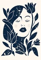 Minimalistisch beeld van een vrouw met tulpen. Een witte achtergrond zonder schaduwen en met een hoog contrast in de blauwe kleur.