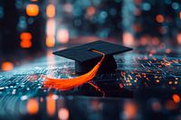 Een symbool van succes en nieuwe horizonten: de klassieke academische mortierplaat met een fel oranje kwastje tegen een futuristische achtergrond van elektrische glamour. Deze afbeelding inspireert en motiveert, perfect voor een kantoor of studeerkamer, waar het creativiteit stimuleert en herinneringen aan behaalde doelen levend houdt.