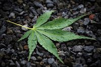 Een prachtig Acer Palmatum blad op donkere lavasteentjes. De regendruppeltjes maken het plaatje compleet.