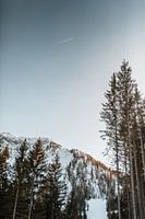 Het einde van een heldere winterse dag in de Oostenrijkse Alpen. Besneeuwde bergen, hoge dennenbomen, indrukwekkende rotspartijen en strak blauwe luchten