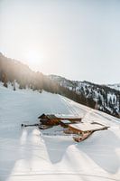 Het einde van een heldere winterse dag in de Oostenrijkse Alpen. Besneeuwde bergen, hoge dennenbomen, afgelegen cabins en strak blauwe luchten.