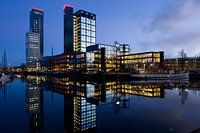 Bepalend stadsgezicht van Leeuwarden: de twee hoogste kantoortorens van de stad bij het vallen van de avond met hun reflectie in het water. De torens zijn beeldbepalend voor Leeuwarden en met helder weer vanuit een groot deel van Friesland zichtbaar
