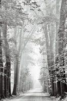 zwart wit bosweg gehuld in de mist