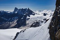 De foto toont een berggroep hoog in het Mont Blanc-massief, op een hoogte van meer dan 3000 meter. Er is een team bergbeklimmers te zien die afdalen. Een zee van wolken spreidt zich achter hen uit en bedekt de valleien als een zachte deken. Slechts enkele steile pieken doorboren de witte uitgestrektheid en stijgen op in de helderblauwe lucht. Het besneeuwde landschap straalt rust en majesteit uit - een moment tussen hemel en aarde, waarin natuur en stilte samensmelten tot een indrukwekkende eenheid.