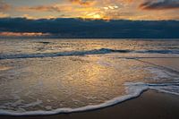 Strand aan de Voordijk tussen Callantsoog en Groote Keeten tijdens de zonsondergang van 14 mei 2021. De golven laten plukjes zeeschuim achter op het stand.