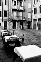 Deze foto legt de veelzijdige dynamiek van het dagelijks leven in Venetië vast. De blik gaat over de gedekte tafels van een restaurant naar de achtergrond, waar een in het wit geklede arbeider te midden van het straatbeeld zijn werk doet.