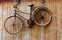 Verlaten plekken. Oude Vietnamese fiets (rijwiel) met roest hangt aan touwen op een rustieke en verweerde muur van bamboe. Achtergelaten in een huis, Mai Chau, Vietnam. Muurdecoratie in sepia kleuren. Urban exploring. Urbex.