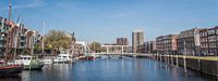 De Achterhaven in het stadsdeel Delfshaven in Rotterdam. Uitzicht op de V.O.C. brug met aan de rechterzijde de Bataviakade waarachter het V.O.C. plein zich bevindt.