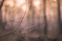 close up van een prachtig spinnenweb in het bos, waar het zonlicht van de vroege ochtend voor een mooie warme kleur zorgt