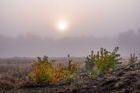 Landschap in Veldhoek, in de Achterhoek in Gelderland, met zicht op enkele struiken die al mooie herfstkleuren hebben, met op de achtergrond een mistige zonsopkomst