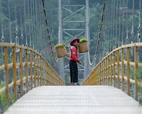 Een jonge Javaanse boer die gras bij de rivier heeft gehaald voor zijn geiten. Hij staat op een nieuwe voetgangers brug ook gebruikt door brommers en fietsen, zodat ze niet ver om hoeven te rijden.