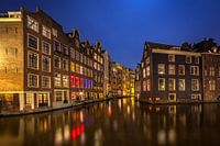 Avond foto van de achterzijde van de Zeedijk in Amsterdam, Nederland met oude gevels aan de gracht, genomen vanaf de Oudezijds Voorburgwal. Prachtige sfeerfoto met oude panden verlicht, inclusief een fraaie reflectie in het water van de gracht.